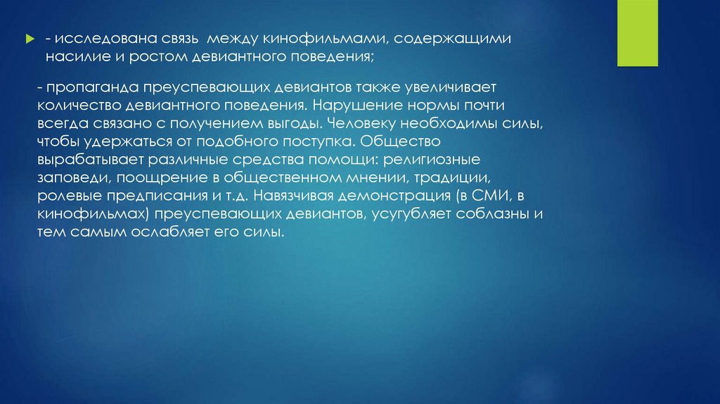 - исследована связь между кинофильмами, содержащиминасилие и ростом девиантного поведения;