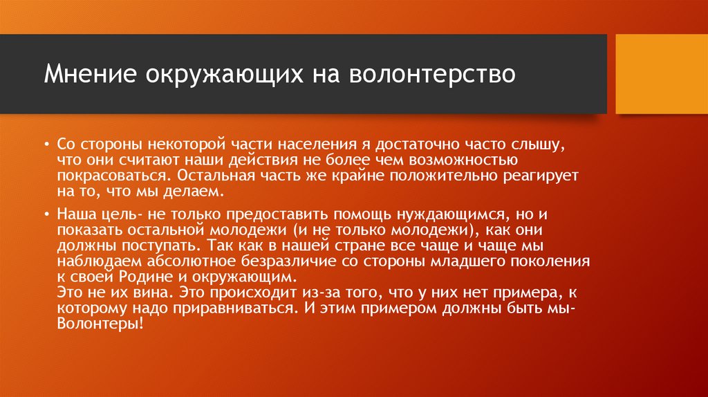 Мнение окружающих на волонтерство• Со стороны некоторой части населения я достаточно часто слышу,
