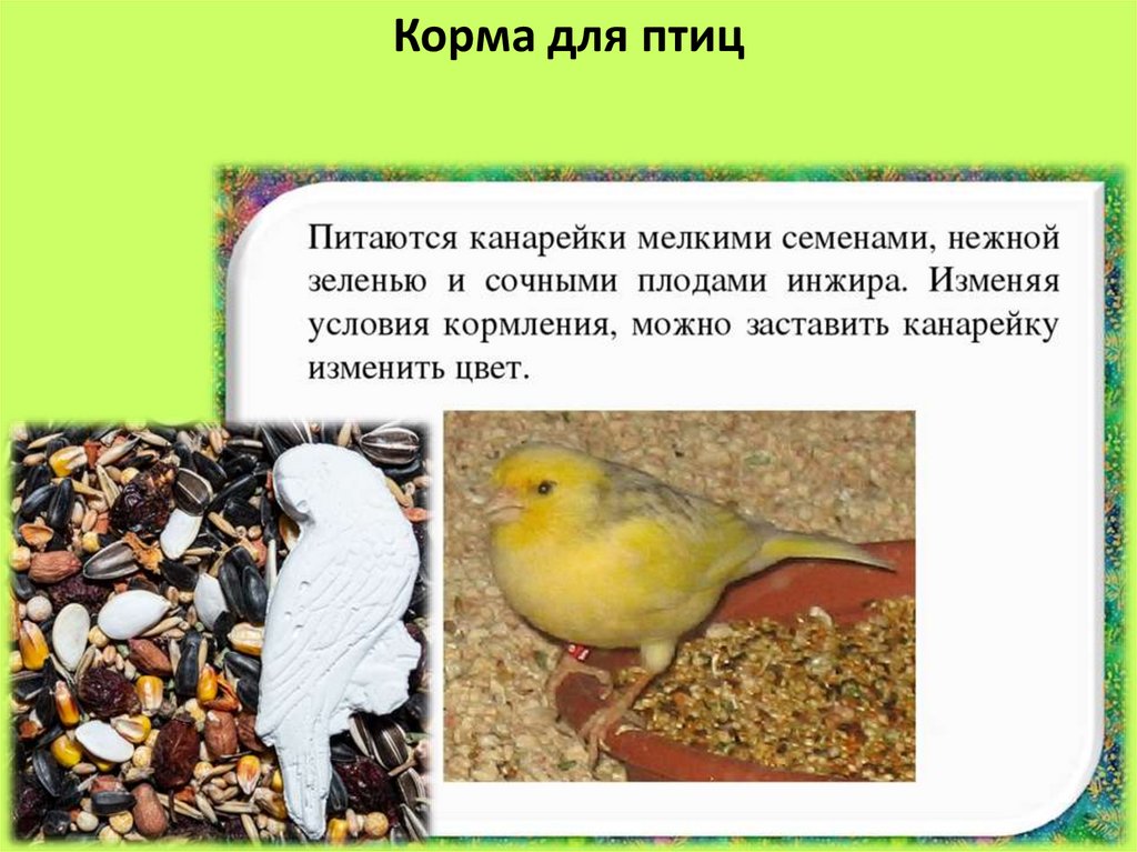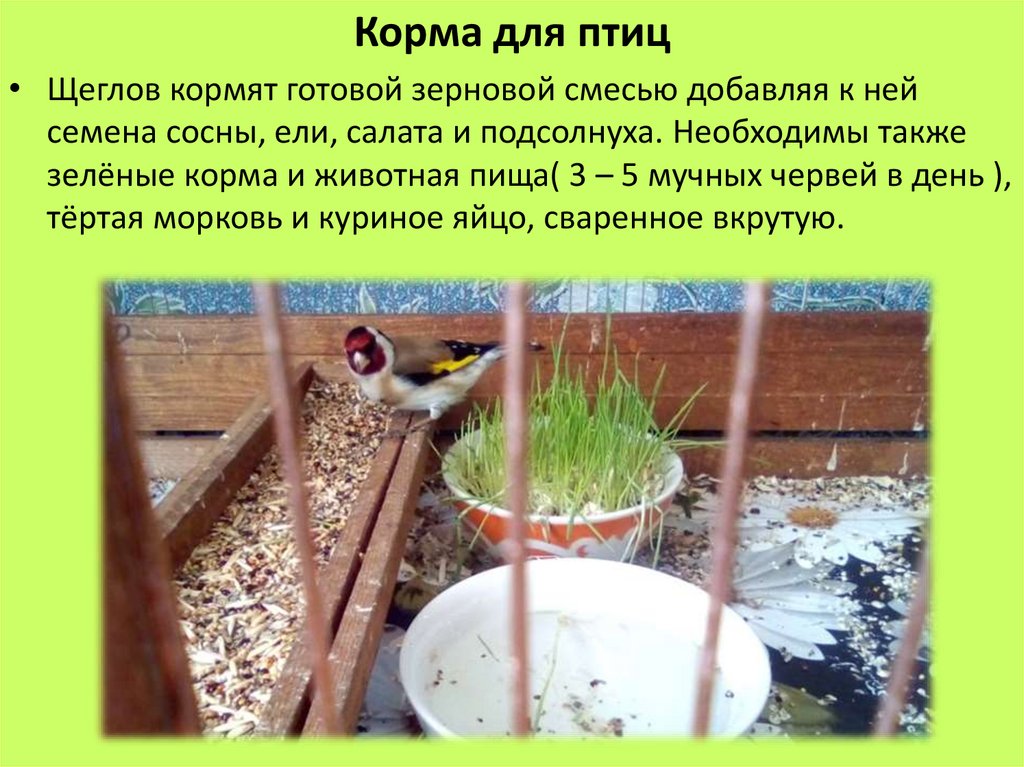 Корма для птиц• Щеглов кормят готовой зерновой смесью добавляя к ней