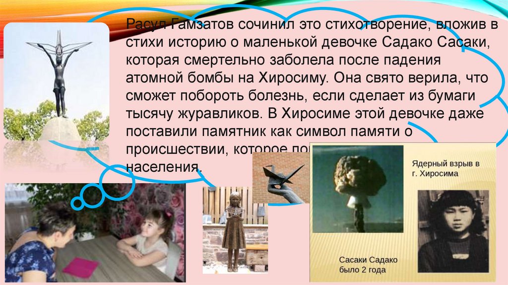 Расул Гамзатов сочинил это стихотворение, вложив встихи историю о маленькой девочке Садако Сасаки,