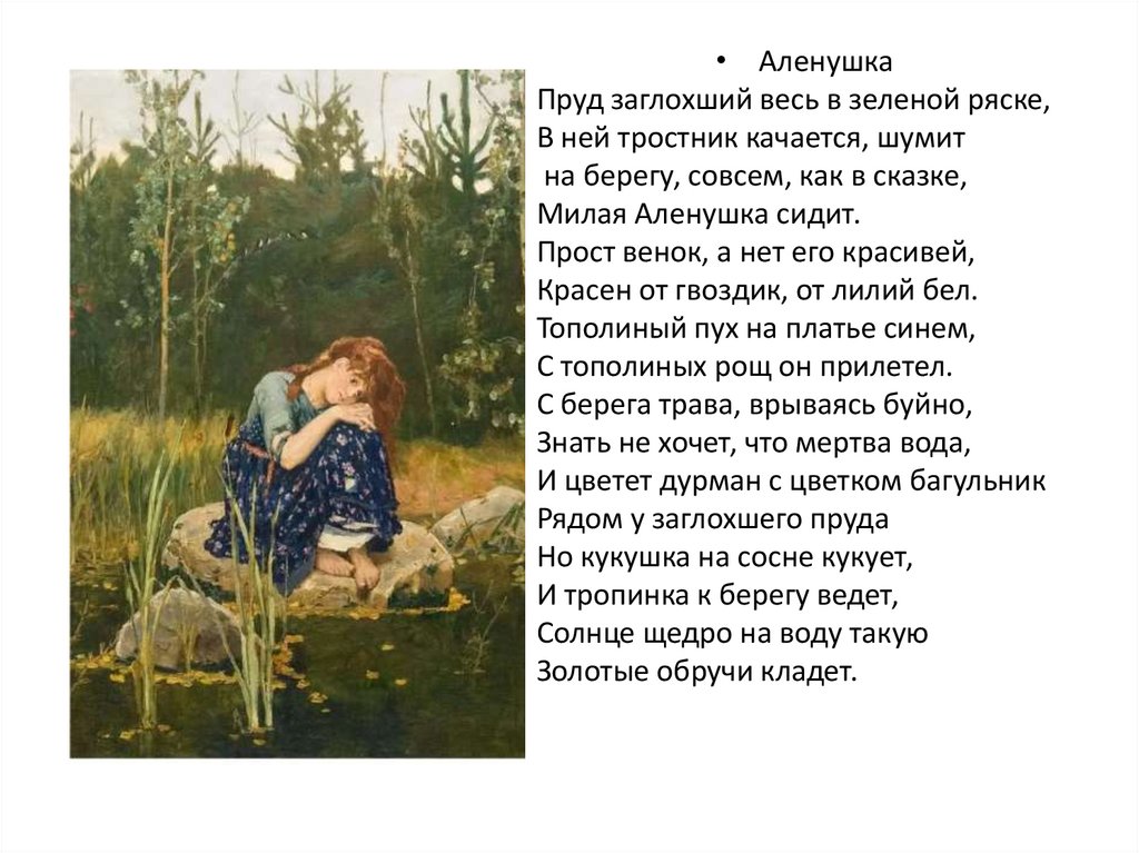 • АленушкаПруд заглохший весь в зеленой ряске,