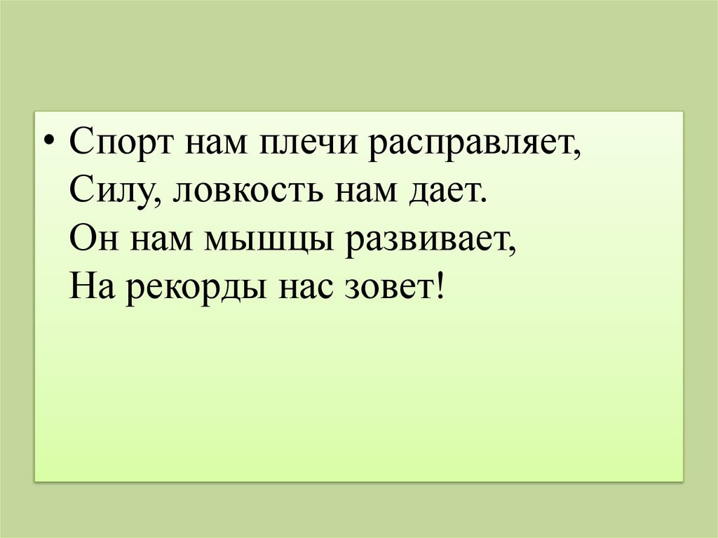 • Спорт нам плечи расправляет,Силу, ловкость нам дает.