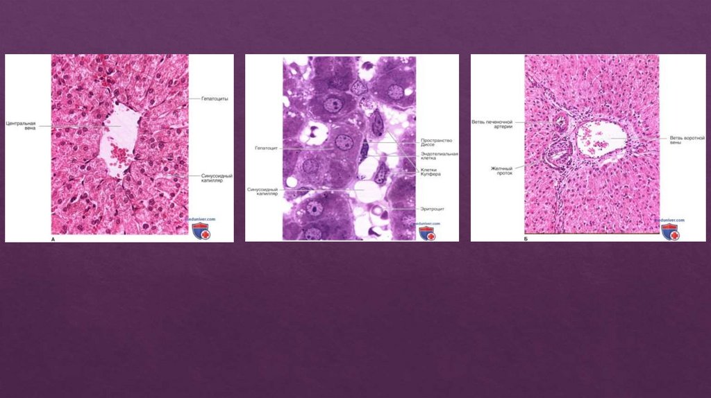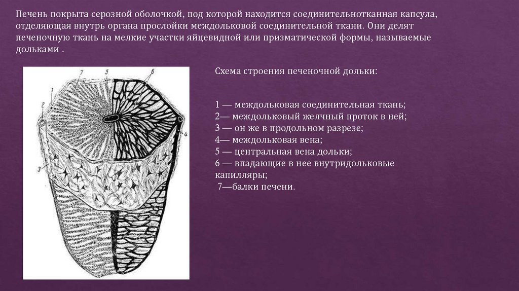 Печень покрыта серозной оболочкой, под которой находится соединительнотканная капсула,отделяющая внутрь органа прослойки междольковой соединительной ткани. Они делят