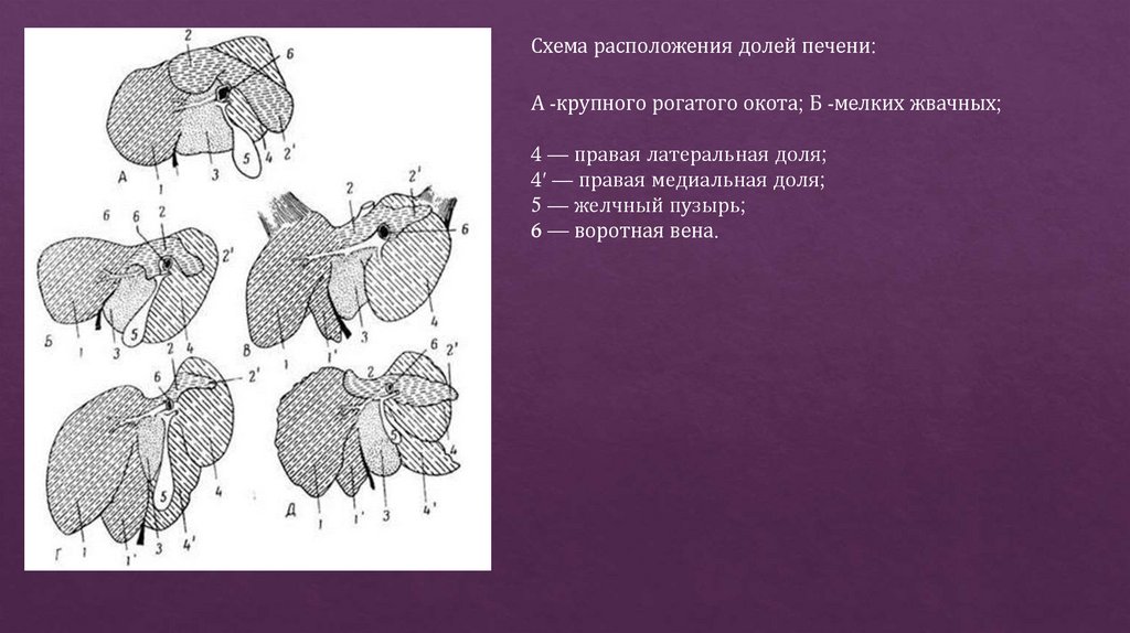 Схема расположения долей печени:А -крупного рогатого окота; Б -мелких жвачных;