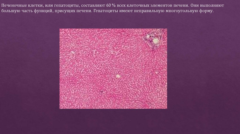 Печеночные клетки, или гепатоциты, составляют 60 % всех клеточных элементов печени. Они выполняютбольшую часть функций, присущих печени. Гепатоциты имеют неправильную многоугольную форму.