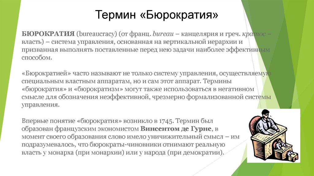 Впервые понятие «бюрократия» возникло в 1745. Термин был