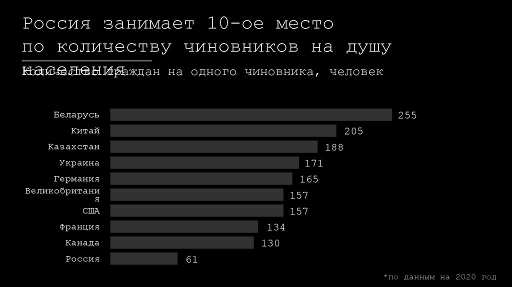 Россия занимает 10-ое местопо количеству чиновников на душу