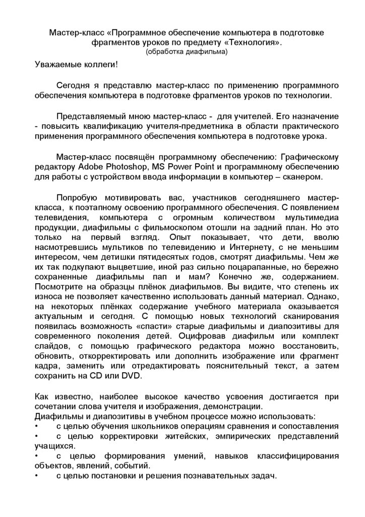 Мастер-класс «Программное обеспечение компьютера в подготовкефрагментов уроков по предмету «Технология».