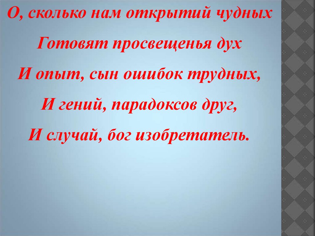 О, сколько нам открытий чудныхГотовят просвещенья дух