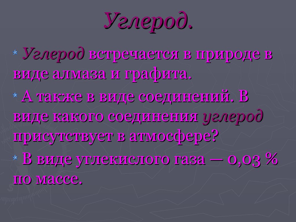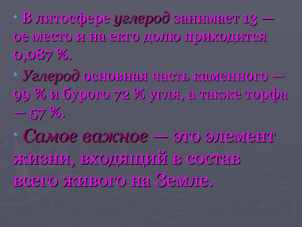 В литосфере углерод занимает 13 —ое место и на екго долю приходится