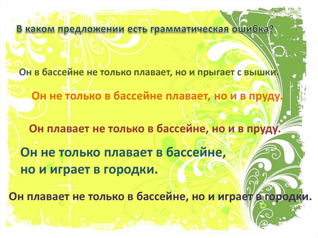Он в бассейне не только плавает, но и прыгает с вышки.Он не только в бассейне плавает, но и в пруду.