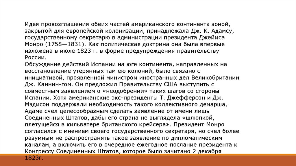 Идея провозглашения обеих частей американского континента зоной,закрытой для европейской колонизации, принадлежала Дж. К. Адамсу,