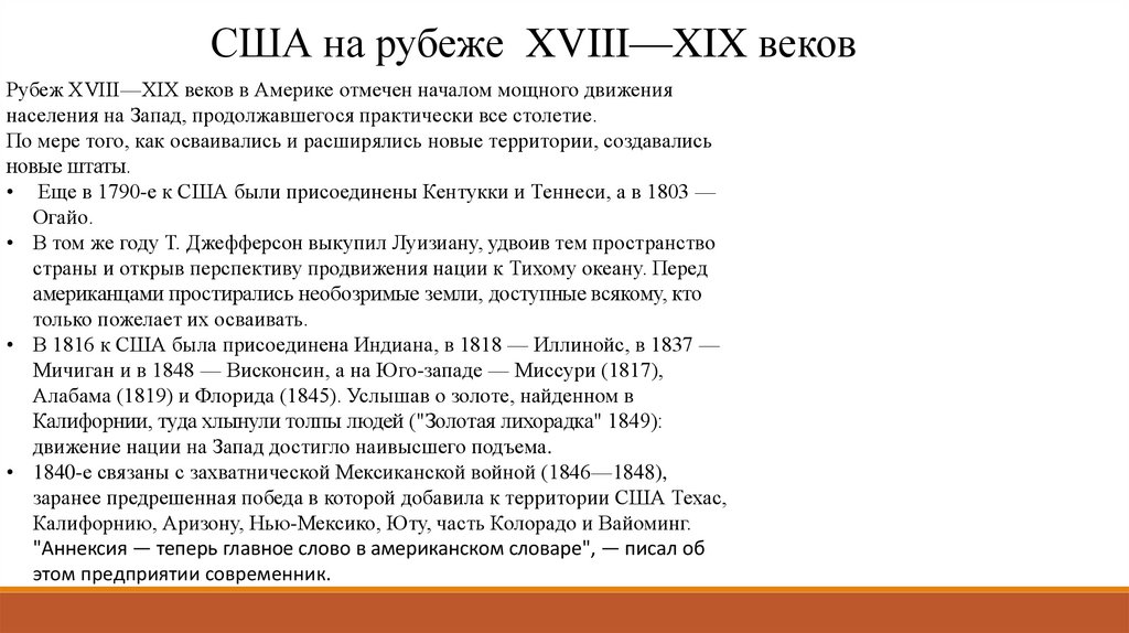 США на рубеже XVIII—XIX вековРубеж XVIII—XIX веков в Америке отмечен началом мощного движения