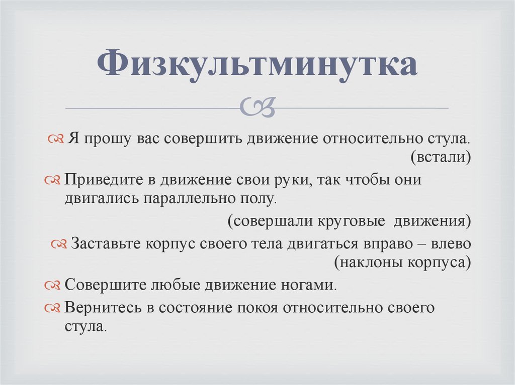 ФизкультминуткаЯ прошу вас совершить движение относительно стула.