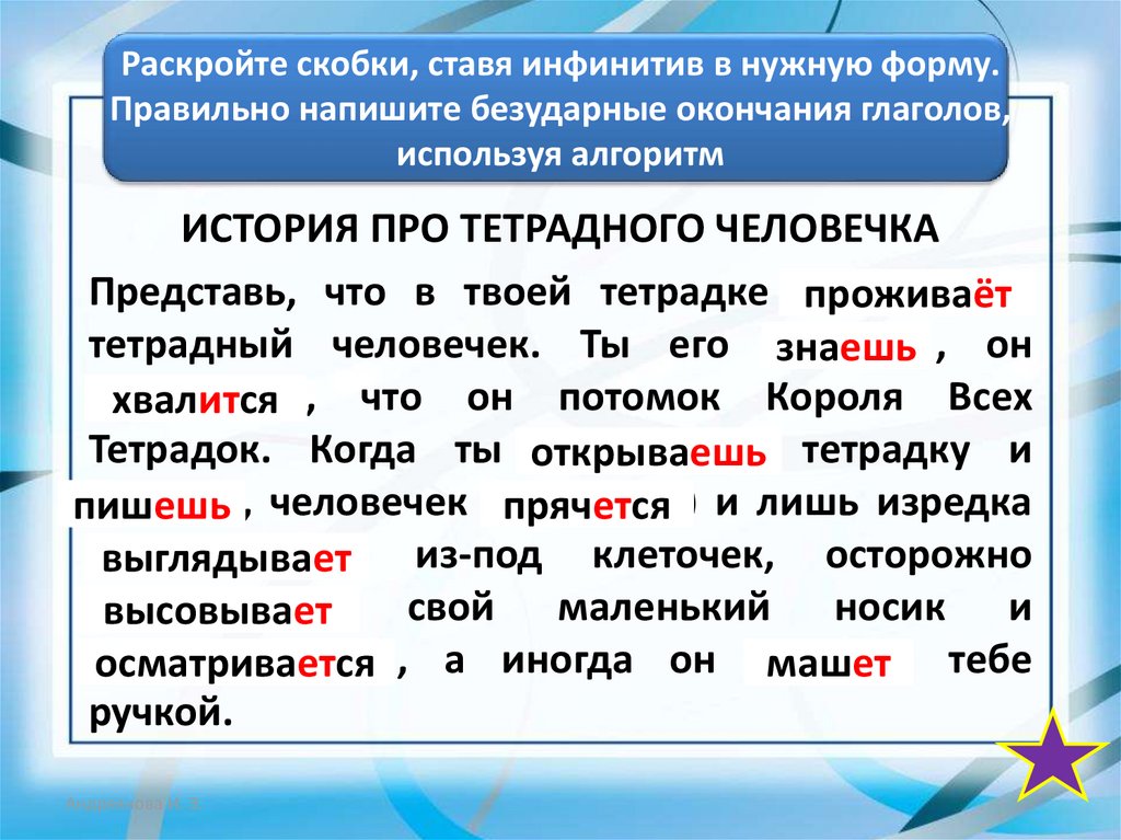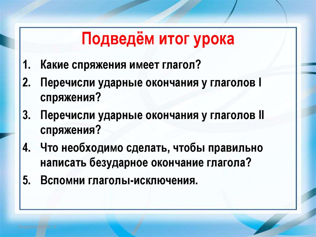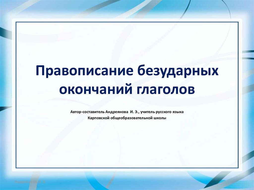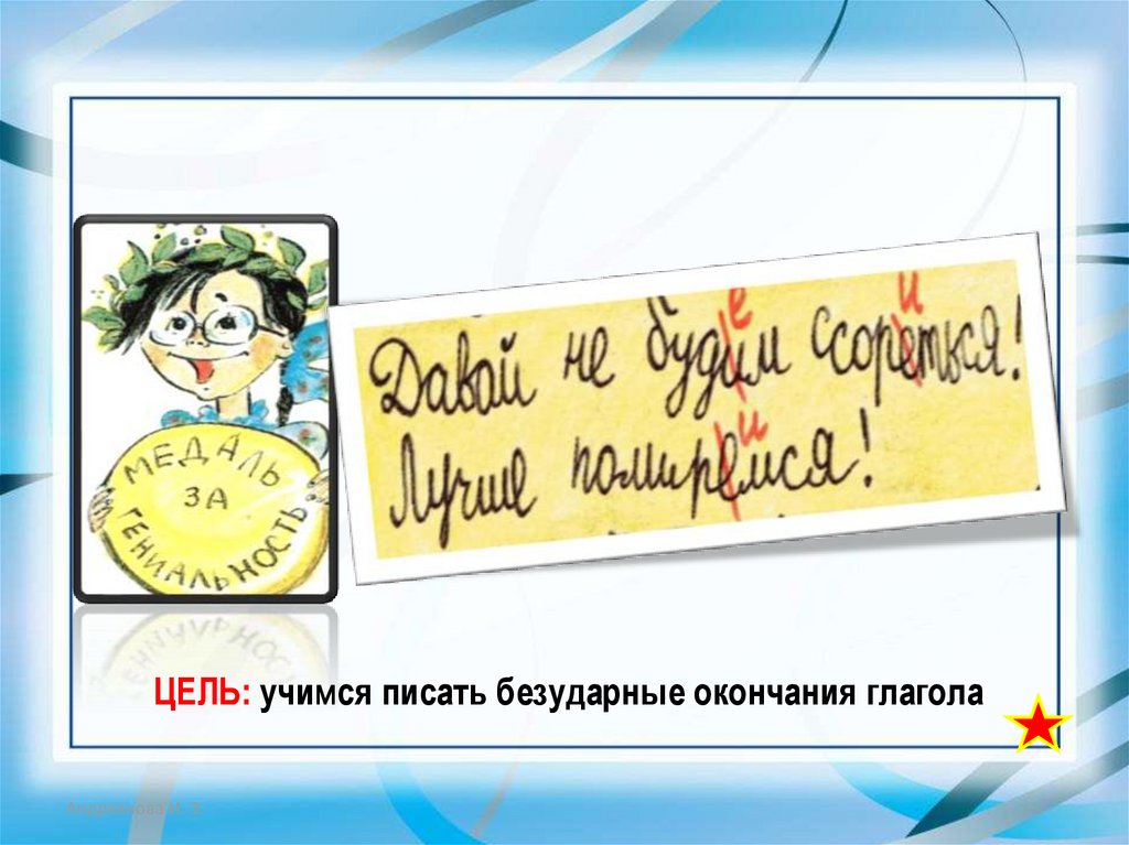 ЦЕЛЬ: учимся писать безударные окончания глаголаАндреянова И. Э.