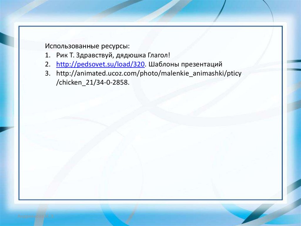 Использованные ресурсы:1. Рик Т. Здравствуй, дядюшка Глагол!