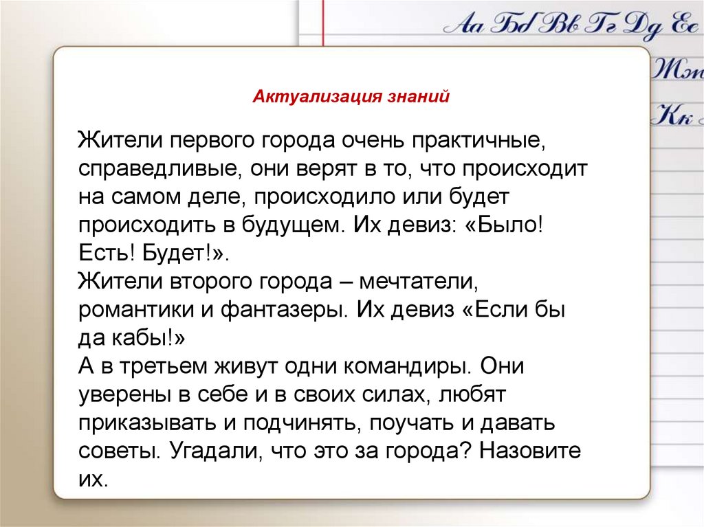 Актуализация знанийЖители первого города очень практичные,