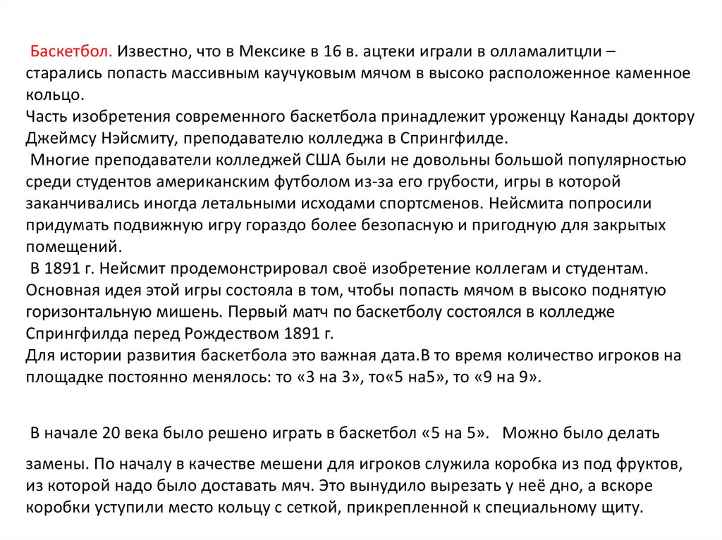 Баскетбол. Известно, что в Мексике в 16 в. ацтеки играли в олламалитцли –старались попасть массивным каучуковым мячом в высоко расположенное каменное