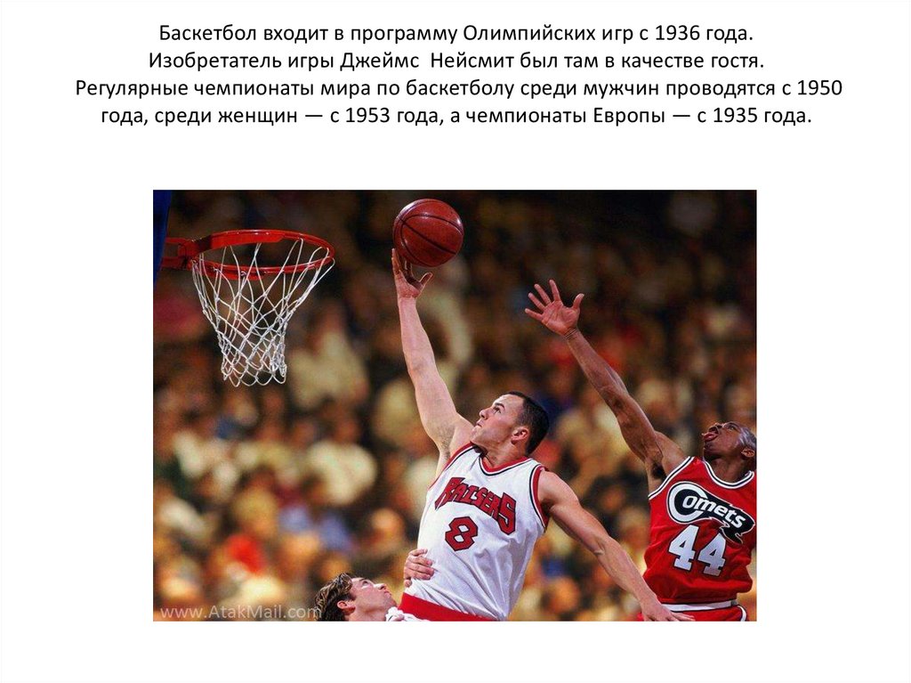 Баскетбол входит в программу Олимпийских игр с 1936 года.Изобретатель игры Джеймс Нейсмит был там в качестве гостя.