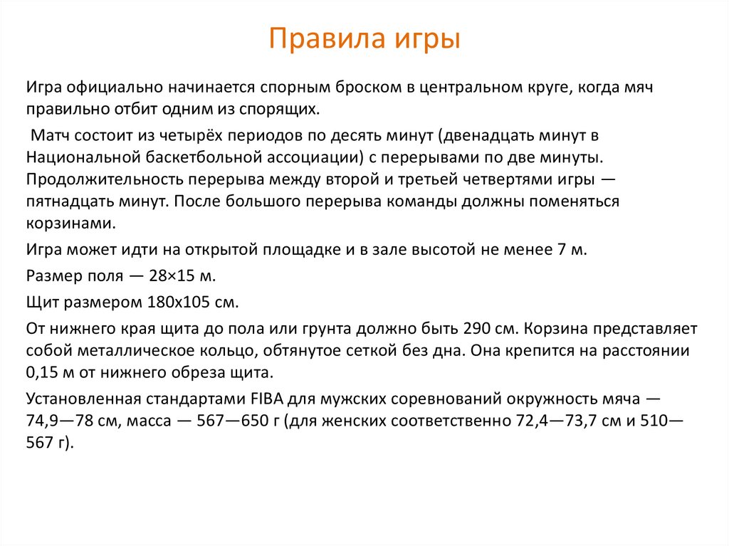 Правила игрыИгра официально начинается спорным броском в центральном круге, когда мяч