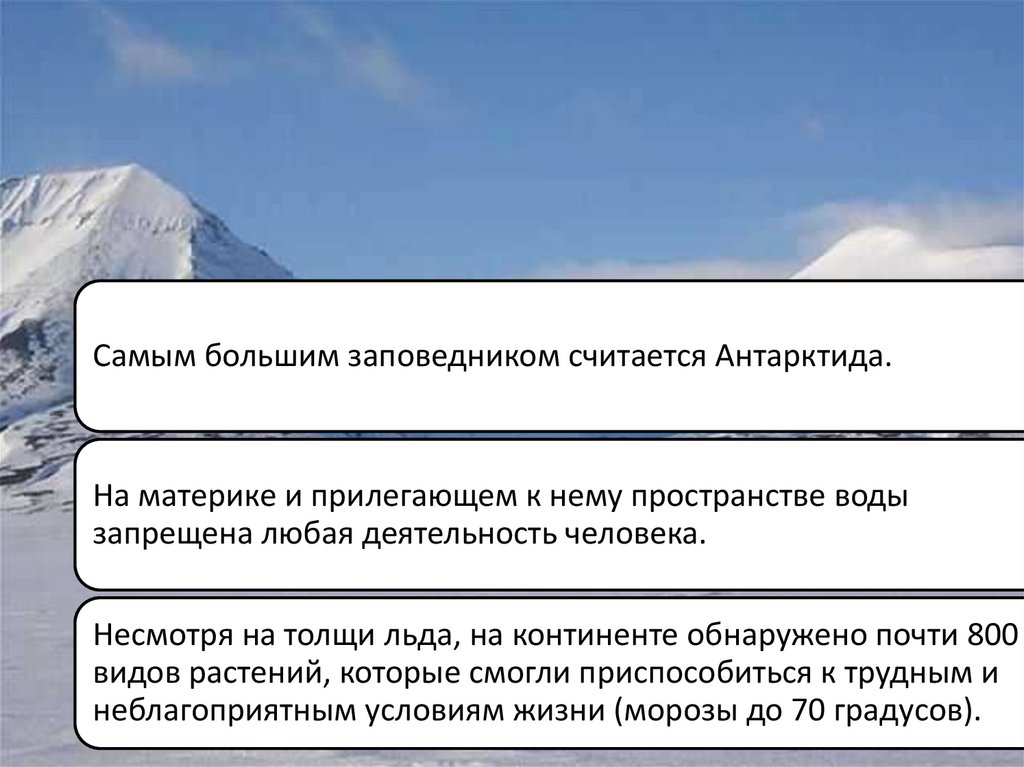 Самым большим заповедником считается Антарктида.На материке и прилегающем к нему пространстве воды