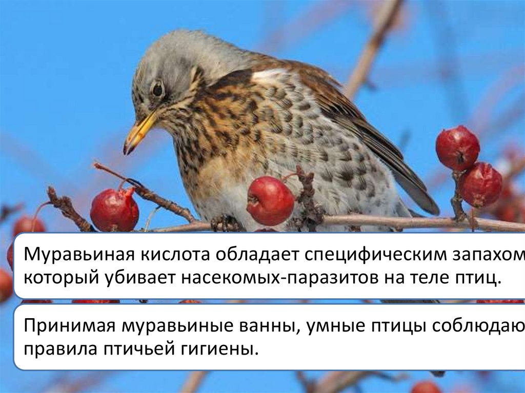 Муравьиная кислота обладает специфическим запахомкоторый убивает насекомых-паразитов на теле птиц.