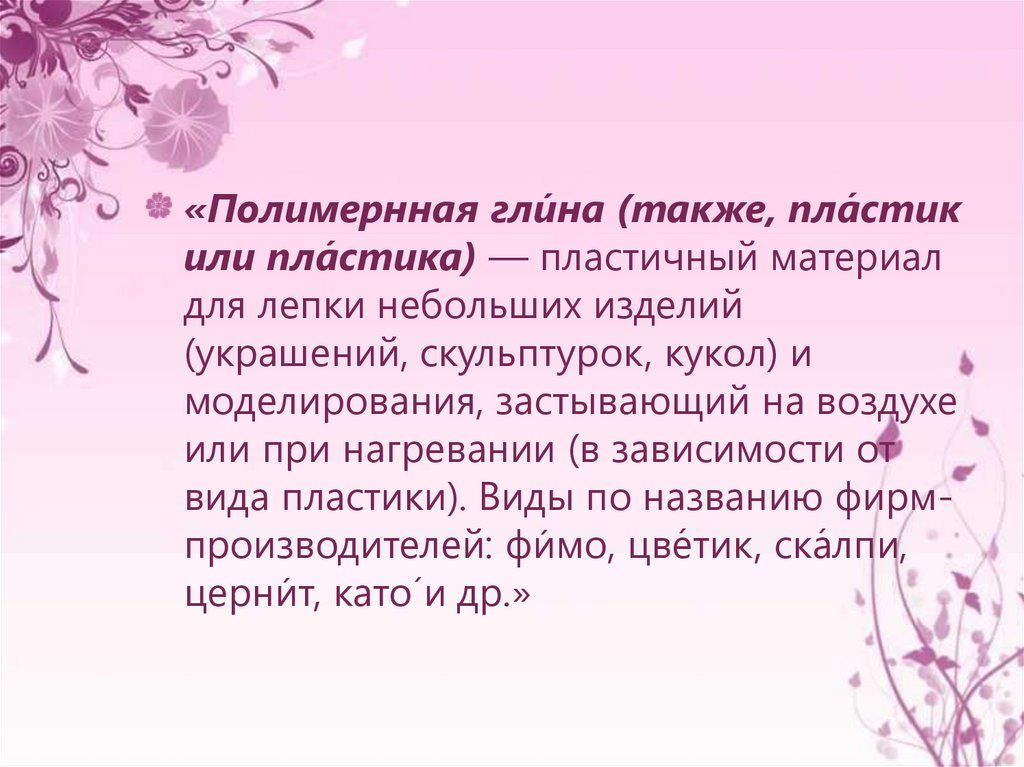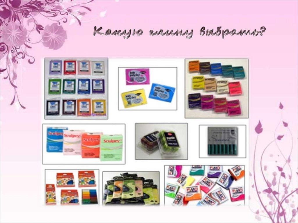вида пластики). Виды по названию фирмпроизводителей: фи́мо, цве́тик, ска́лпи,