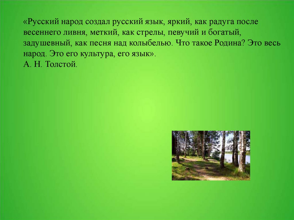 «Русский народ создал русский язык, яркий, как радуга послевесеннего ливня, меткий, как стрелы, певучий и богатый,