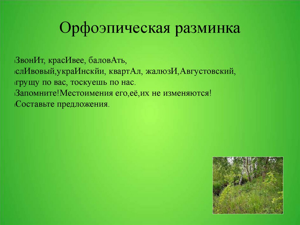 Орфоэпическая разминкаЗвонИт, красИвее, баловАть,