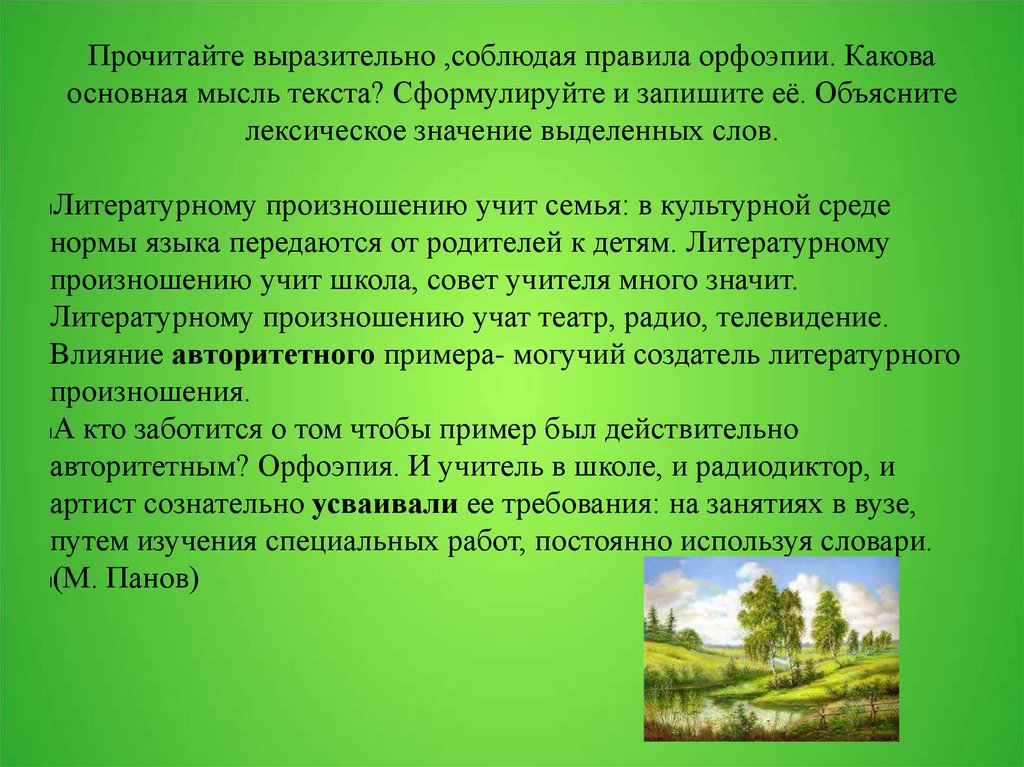 Прочитайте выразительно ,соблюдая правила орфоэпии. Каковаосновная мысль текста? Сформулируйте и запишите её. Объясните