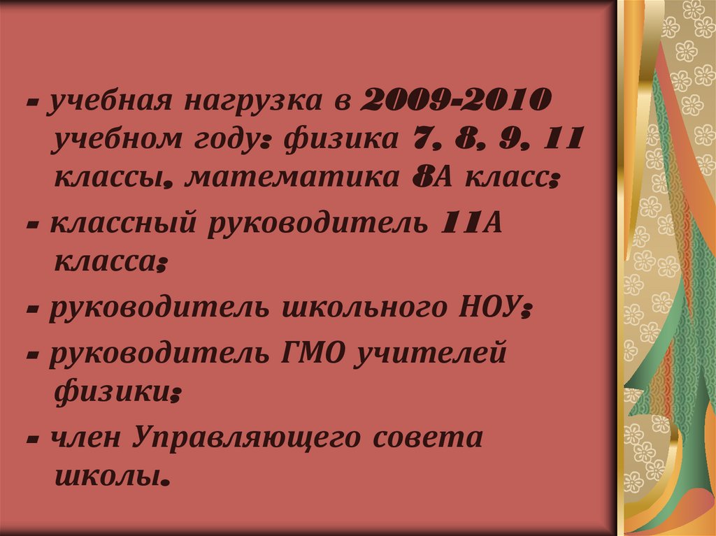 - учебная нагрузка в 2009-2010учебном году: физика 7, 8, 9, 11