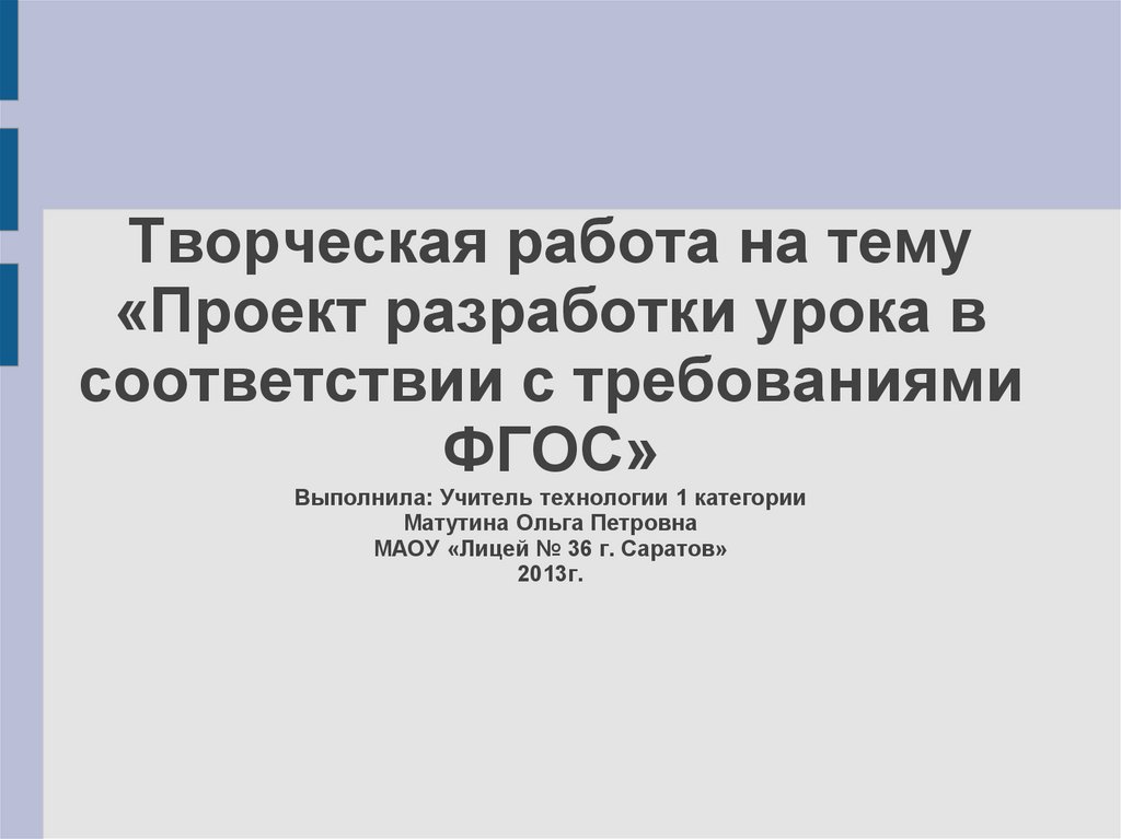 1. Творческая работа на тему «Проект разработки урока в соответствии с требованиями ФГОС» Выполнила: Учитель технологии 1