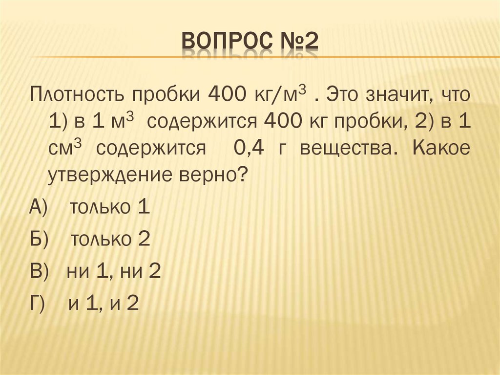 ВОПРОС №2Плотность пробки 400 кг/м3 . Это значит, что