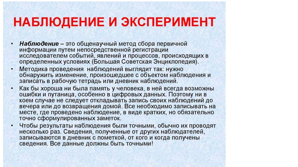 1) научно поставленный опыт, наблюдение исследуемого явления в научно учитываемых условиях,