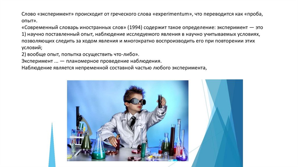 Слово «эксперимент» происходит от греческого слова «experimentum», что переводится как «проба,опыт».