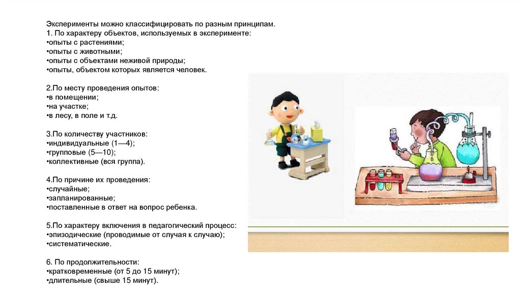 Эксперименты можно классифицировать по разным принципам.1. По характеру объектов, используемых в эксперименте: