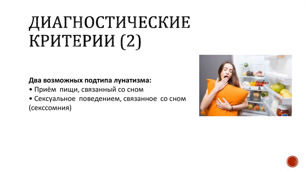 Два возможных подтипа лунатизма:• Приём пищи, связанный со сном
