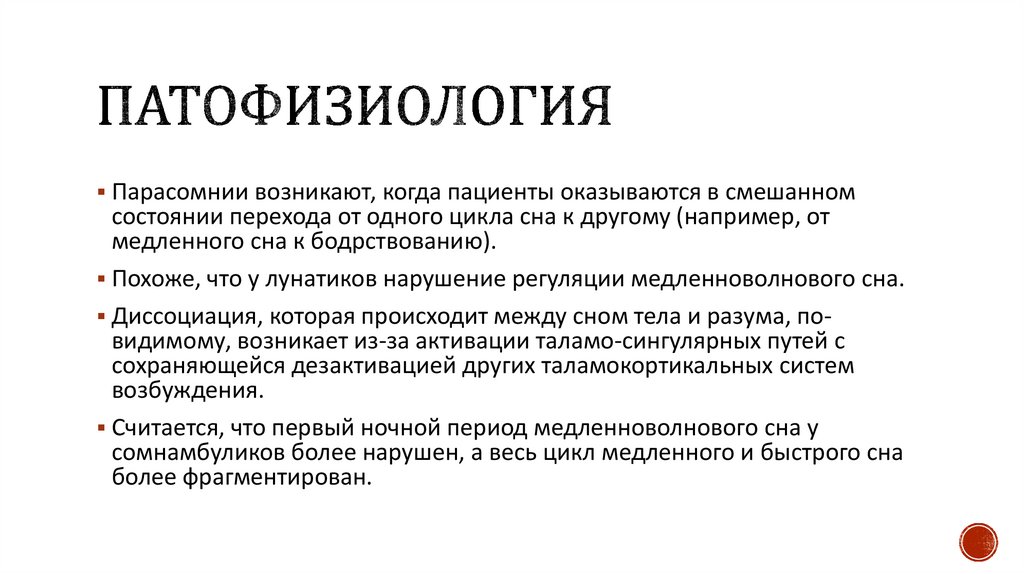 Парасомнии возникают, когда пациенты оказываются в смешанномсостоянии перехода от одного цикла сна к другому (например, от