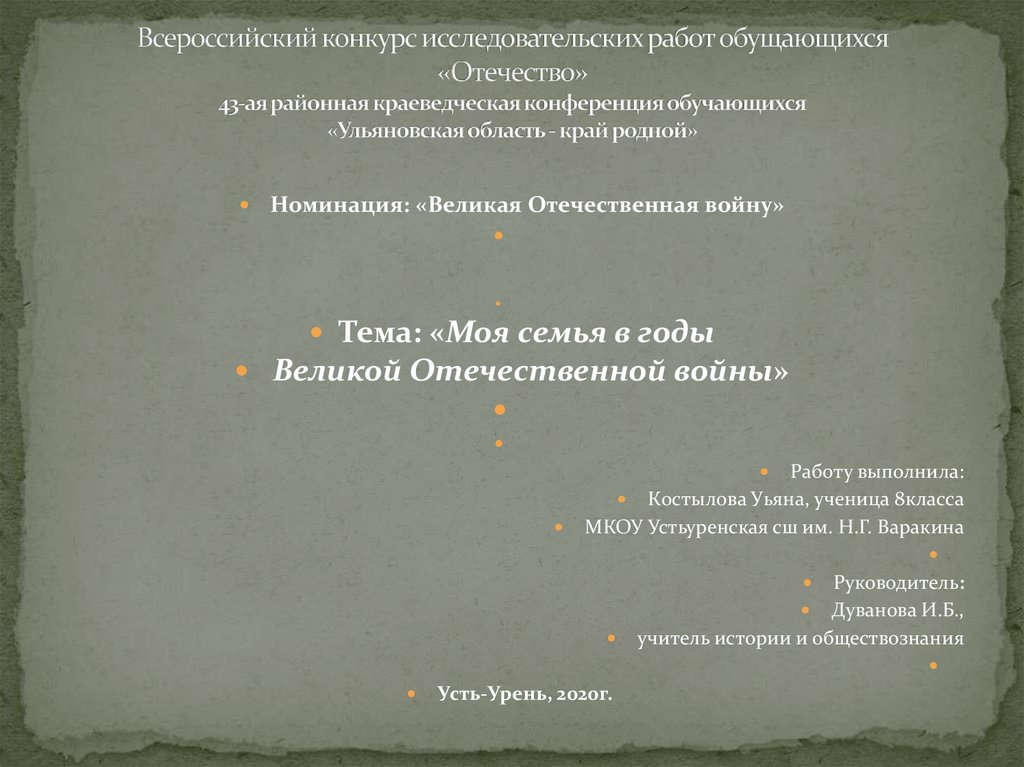 Номинация: «Великая Отечественная войну»Тема: «Моя семья в годы