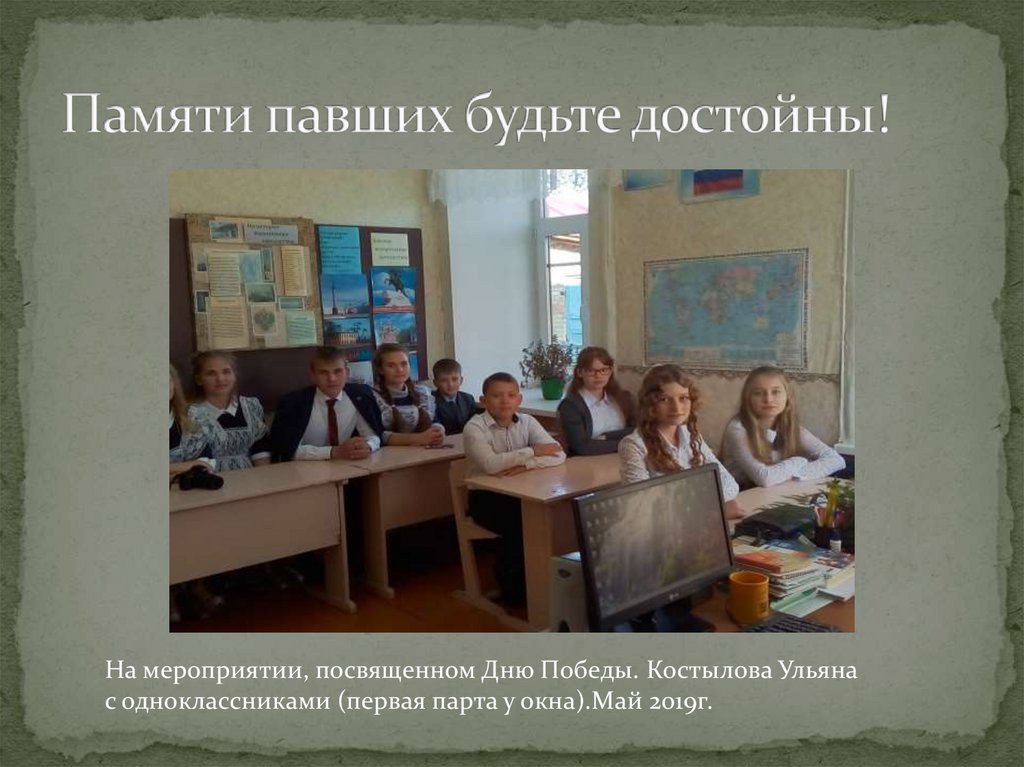 На мероприятии, посвященном Дню Победы. Костылова Ульянас одноклассниками (первая парта у окна).Май 2019г.