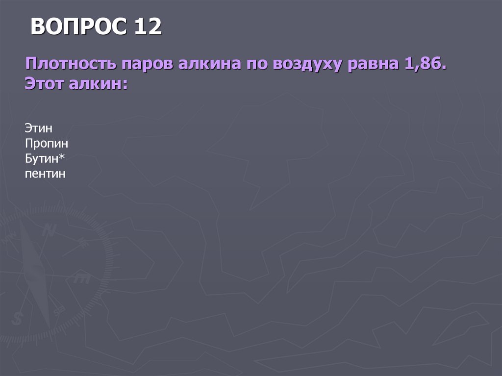 ВОПРОС 12Плотность паров алкина по воздуху равна 1,86.