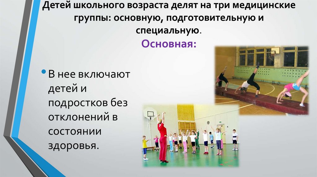 Детей школьного возраста делят на три медицинскиегруппы: основную, подготовительную и