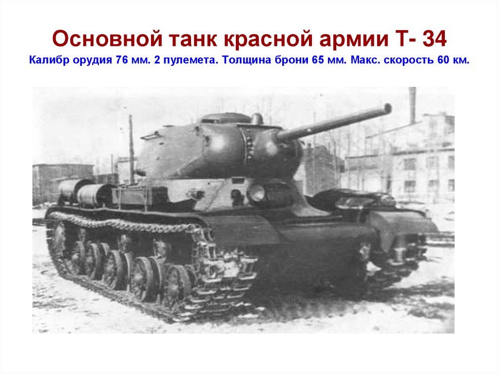 Основной танк красной армии Т- 34Калибр орудия 76 мм. 2 пулемета. Толщина брони 65 мм. Макс. скорость 60 км.