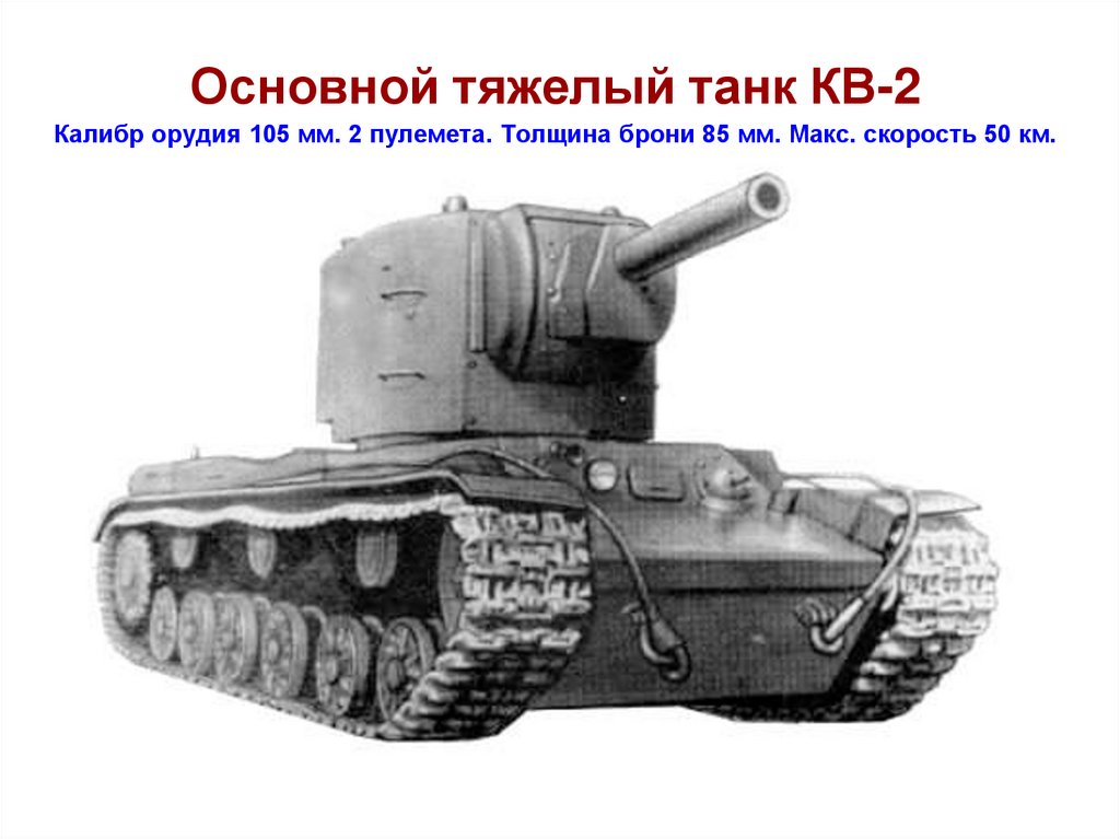 Основной тяжелый танк КВ-2Калибр орудия 105 мм. 2 пулемета. Толщина брони 85 мм. Макс. скорость 50 км.