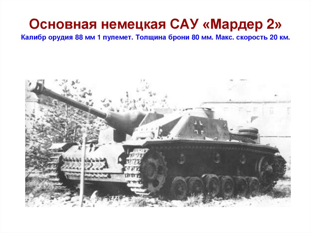 Основная немецкая САУ «Мардер 2»Калибр орудия 88 мм 1 пулемет. Толщина брони 80 мм. Макс. скорость 20 км.