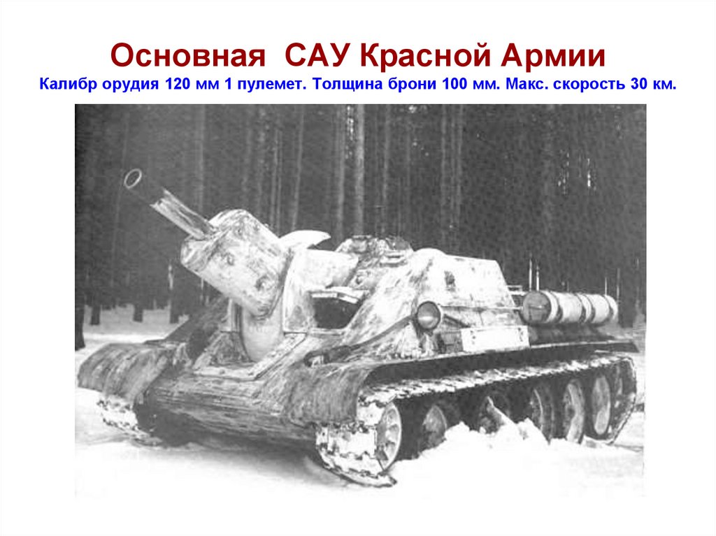 Основная САУ Красной АрмииКалибр орудия 120 мм 1 пулемет. Толщина брони 100 мм. Макс. скорость 30 км.