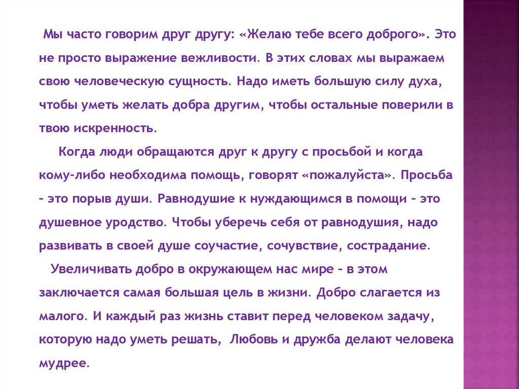 Мы часто говорим друг другу: «Желаю тебе всего доброго». Этоне просто выражение вежливости. В этих словах мы выражаем