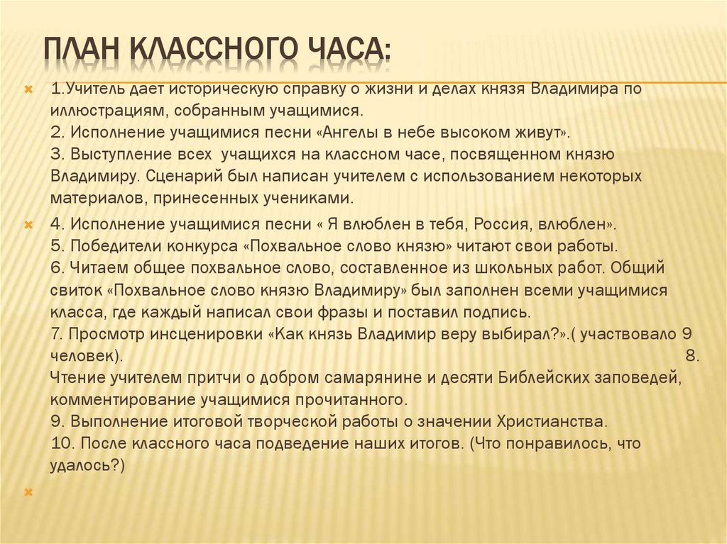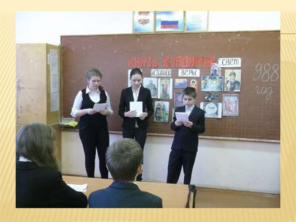 ПЛАН КЛАССНОГО ЧАСА:1.Учитель дает историческую справку о жизни и делах князя Владимира по