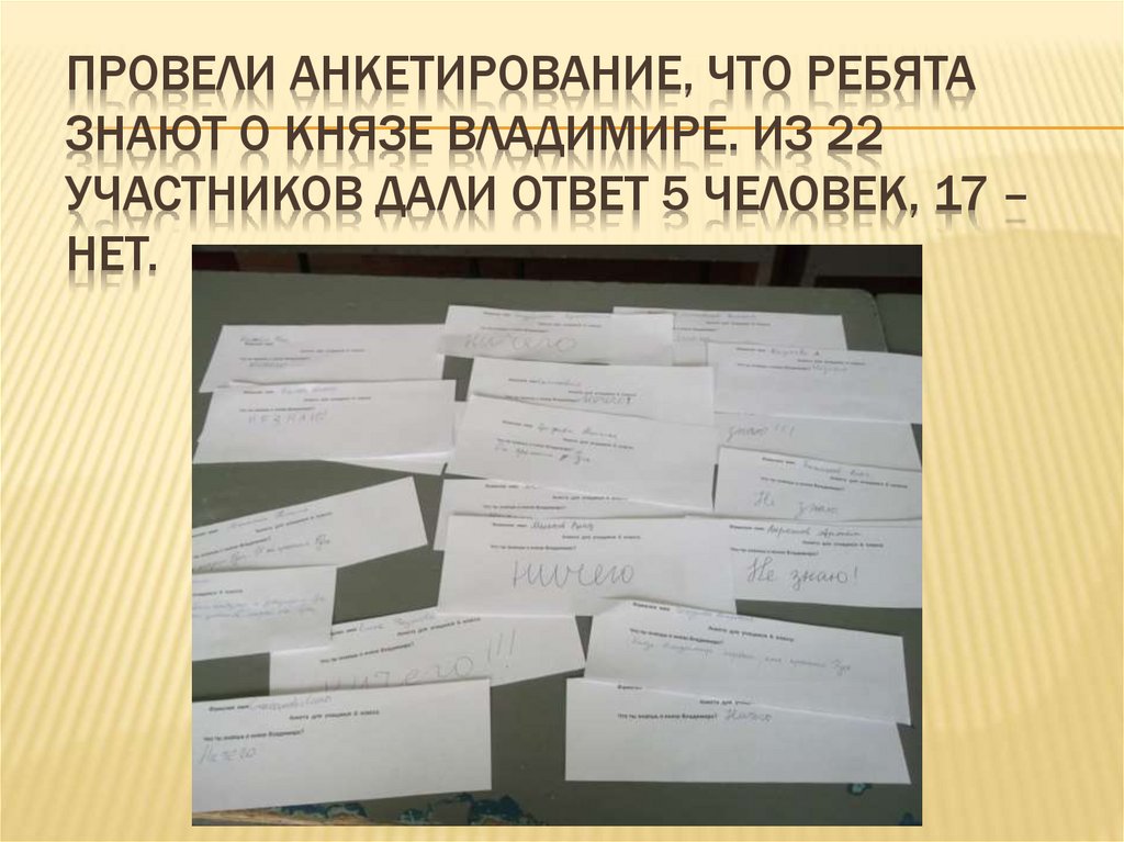 ПРОВЕЛИ АНКЕТИРОВАНИЕ, ЧТО РЕБЯТАЗНАЮТ О КНЯЗЕ ВЛАДИМИРЕ. ИЗ 22