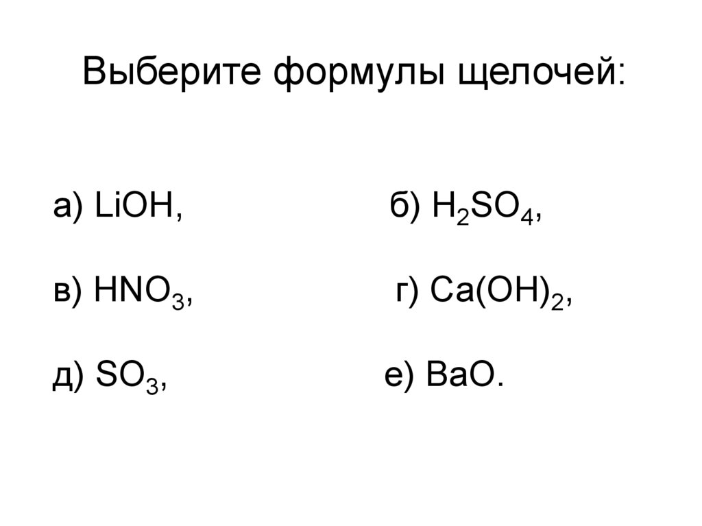 Выберите формулы щелочей:а) LiOH,